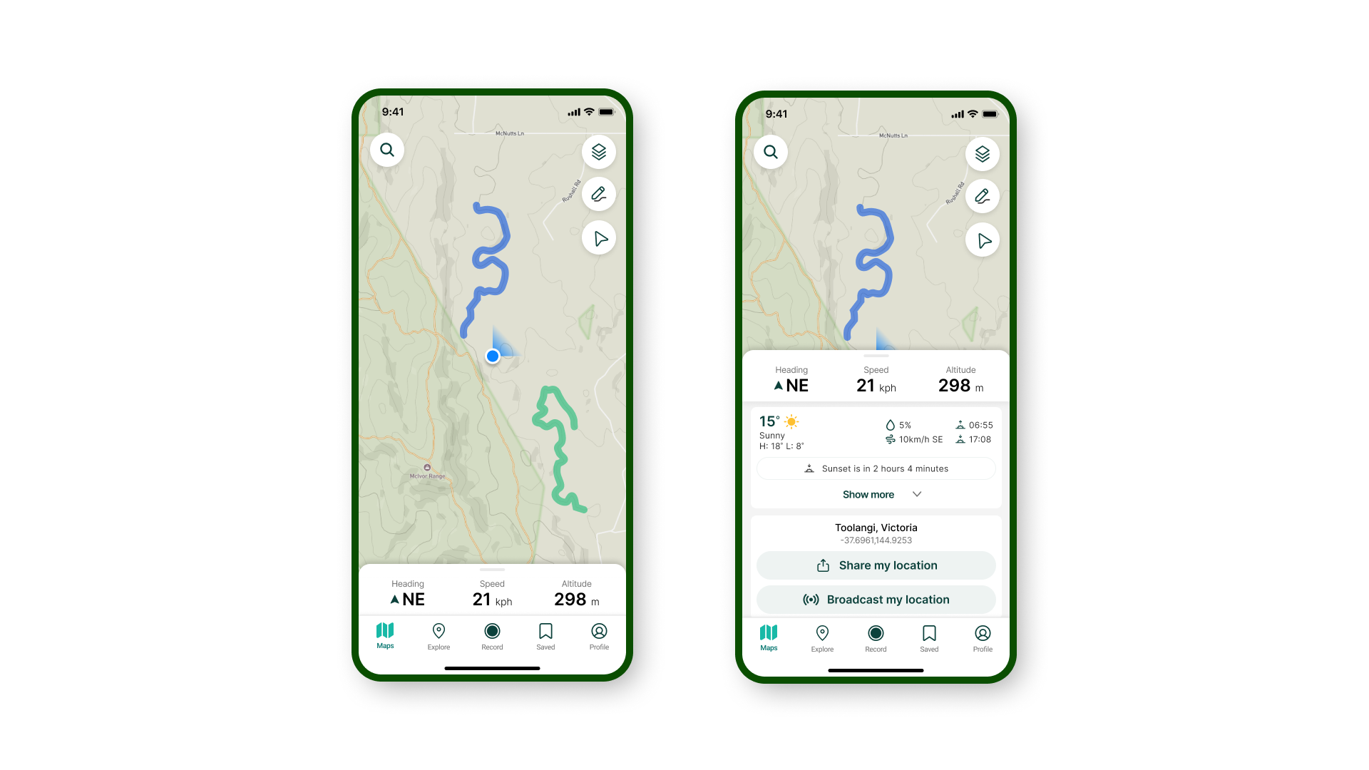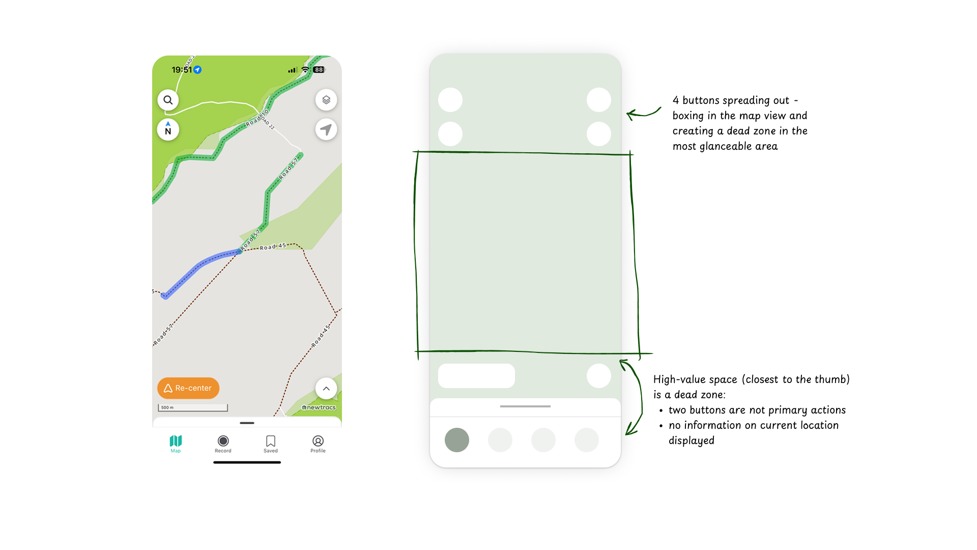 This decision was based on feature priority: users navigating a trail don’t need full app access at all times — just what’s relevant for that moment.